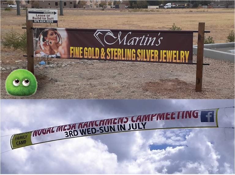 Vinyl or net banners, one or two sided, are inexpensive and lightweight, and can be printed with any graphics. No extra charge for the grommets or pole pocket sleeves! NOTE: Banners are, by nature, designed to be temporary. We have learned ways to hang them that make them last as long as possible (we have seen them go 5+ years). But, no durability warranties can be made.