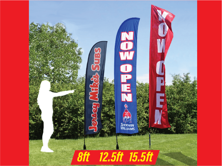 We sell CUSTOM FLAGS and SAIL BANNERS, also known as FEATHER FLAGS – These dye sublimated, full color nylon banners come in three sizes (8ft, 12.5ft, and 15.5ft), and can be 1 or 2-Sided. Stand Alone, Spike Kit (flag, pole, spike stake, carrying case), or Base Kit (flag, pole, water bag x-base, carrying case). NOTE: Sail banners and flags are, by nature, designed to be temporary. No durability warranties can be made.